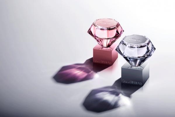 ダイアモンドのブリリアントカットを模したガラスボトルとシルバーのキャップで