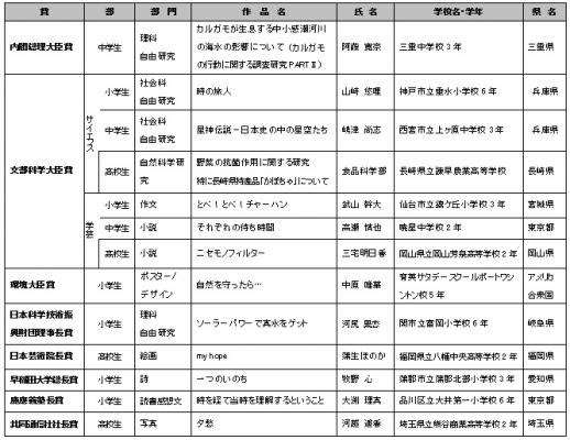 最優秀作品には内閣総理大臣賞・文部科学大臣賞・環境大臣賞などが授与されるほか、優秀作品には各分野賞のほか協賛企業・団体からの表彰も含め、たくさんの賞が授与されます(参加賞は全員にプレゼント)。