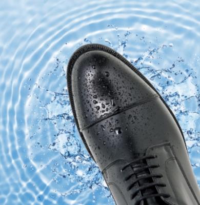 今回用意した防水ビジネスシューズは、「本革素材」を2タイプと「PVC(塩化ビニール樹脂)素材」を2タイプの計4タイプです。どのタイプも、靴底に防滑ゴム素材を使用することで、雨に濡れた滑りやすい路面でも安心して履くことができます。靴内には低反発カップインソールを挿入しており、足を包み込むようなフィット感とやわらかい履き心地を体感できます。