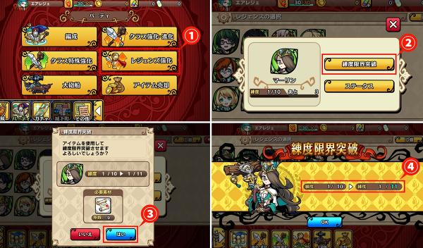 2017年6月13日(火)に練度スクロール機能の実装ならびに城下町レベルキャップ解放を実施いたしました。これにより6月6日(火)から先行入手できていた「練度スクロール」が使用できるようになりました。ゲーム内の「パーティ」画面に新たに追加された「レジェンズ強化」から任意のキャラクターを選択して使用可能です。お気に入りキャラクターの育成にお使いください!