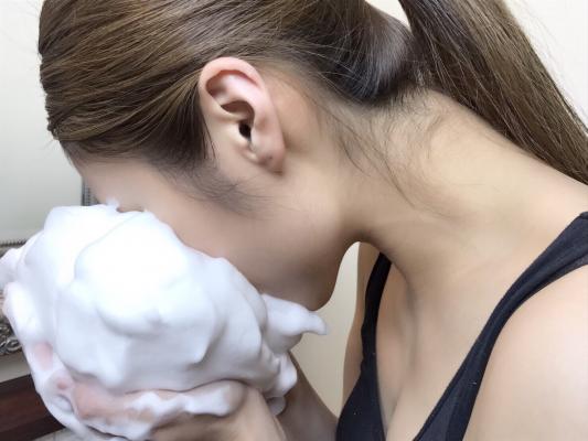 1)両手にいっぱいの泡をゆっくり頬につけ、こすらないように口の中心に向かって伸ばす。