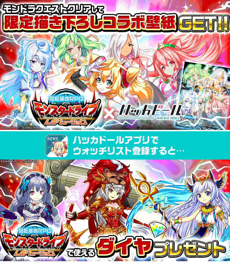 株式会社GIANTY(本社:東京都渋谷区、代表取締役:ホー・トゥン・ラム、以下GIANTY)と株式会社ディー・エヌ・エー(本社:東京都渋谷区、代表取締役社長兼CEO:守安 功、以下DeNA)は、スマートフォン向けゲームアプリ「モンスター ドライブ レボリューション (モンドラ)」において、2017年6月16日(金)より、ニュースアプリ『ハッカドール』とのコラボイベントを開始したことを発表致します。