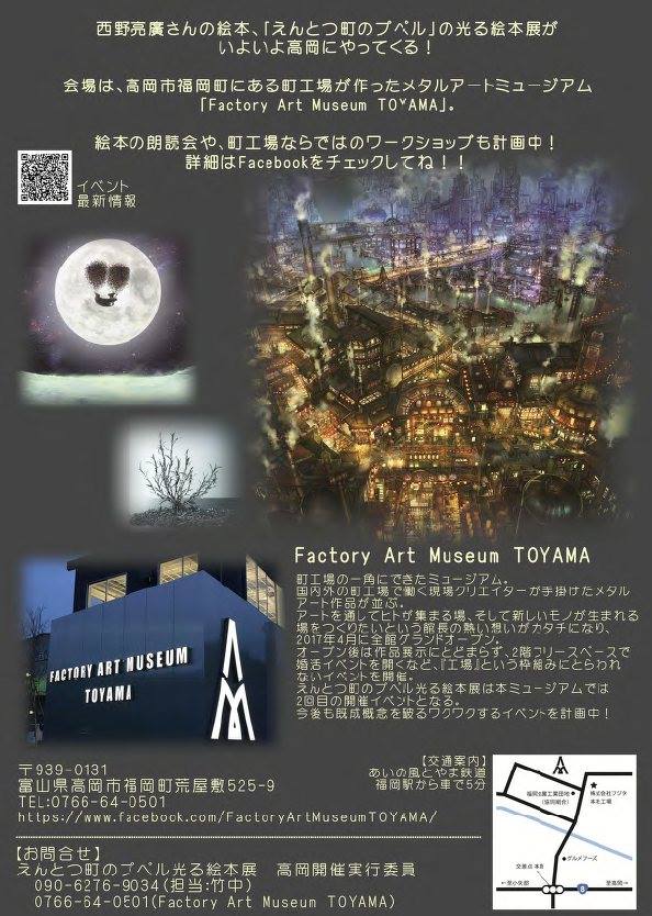 FACTORY ART MUSEUM TOYAMAは日々ものづくり現場で働く技術者たちが切削・溶接・板金などそれぞれの技術で製作した金属のメタルアートを展示する町工場の美術館です。今回こちらの施設で絵本展を開催するにあたり、同絵本に関連するメタルアートを展示したいとの思いで製作しました。