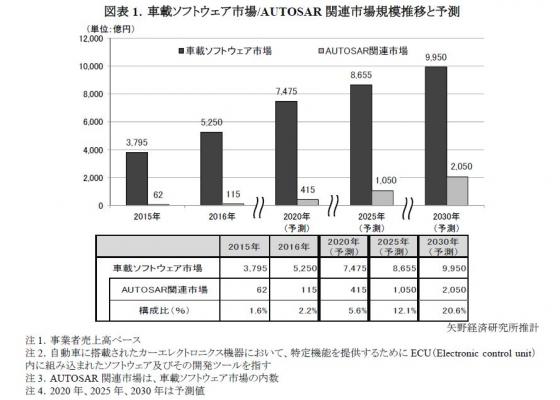 本調査におけるAUTOSAR(Automotive open system architecture)関連市場規模は、車載ソフトウェアの標準化を実現するための仕様であるAUTOSARに準拠したソフトウェアを対象として算出した。