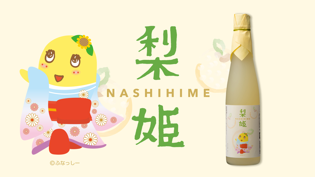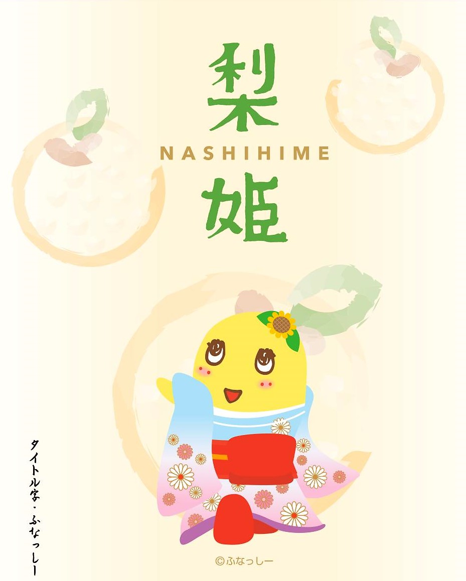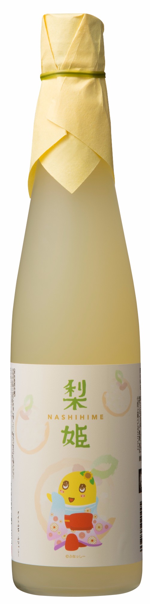 梨リキュールの名前の『梨姫』は “ふなっしー”自らが命名し、タイトルの文字を書く程、熱がこもった自信作です。ラベルには振り袖姿の梨姫が描かれ、ボトルのキャップは梨とヘタを模して“ふなっしー”をイメージしています。お部屋のインテリアにもなる可愛いデザインです。