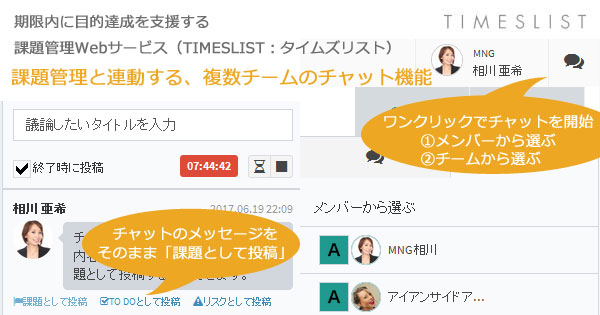 期限内の目的(プロジェクト)達成を支援するため、課題管理を中心とした理論・現場と並走する実践の支援・使いやすいツールの3つを組み合わせて提供する株式会社マネジメント(本社:東京都港区、代表:音羽真東)は、 使いながらみんなの課題解決力と生産性を高める課題管理ツール「TIMESLIST(タイムズリスト)」に、”課題管理と連係できるチャット機能”を2017年6月19日より提供開始しました。