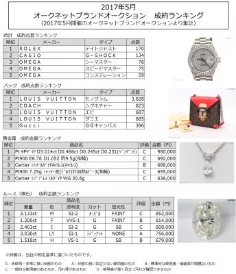情報流通支援サービスの株式会社オークネット(本社:東京都港区/社長:藤崎清孝)は、2017年5月度のオークネットブランドオークションにおける成約点数および成約金額を集計し、ランキングベスト5をまとめました。
