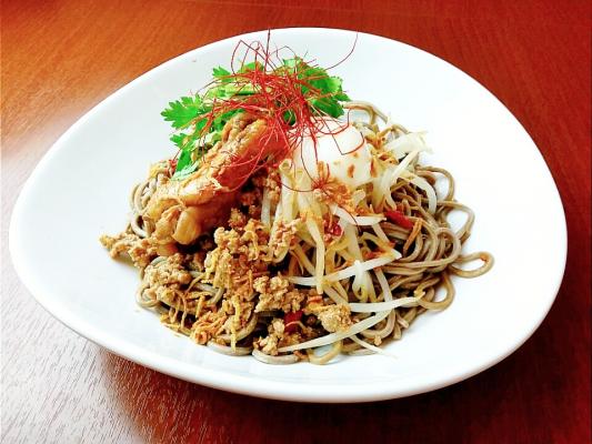 ・メニュー名 ピリ辛タイ風和え蕎麦 ~熱盛りの特製太麺蕎麦~