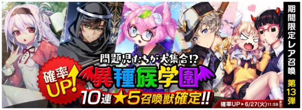 初登場を記念して、「異種族学園」の確率アップを開催いたします。