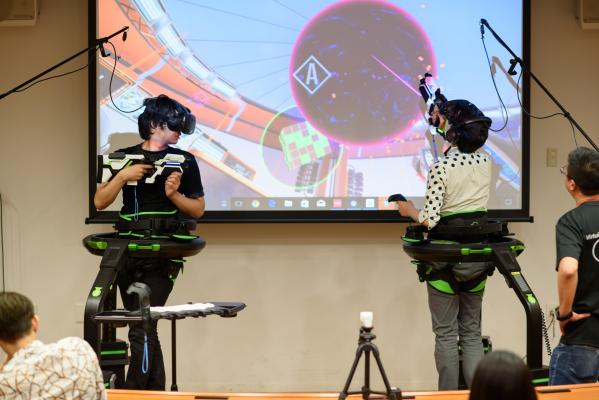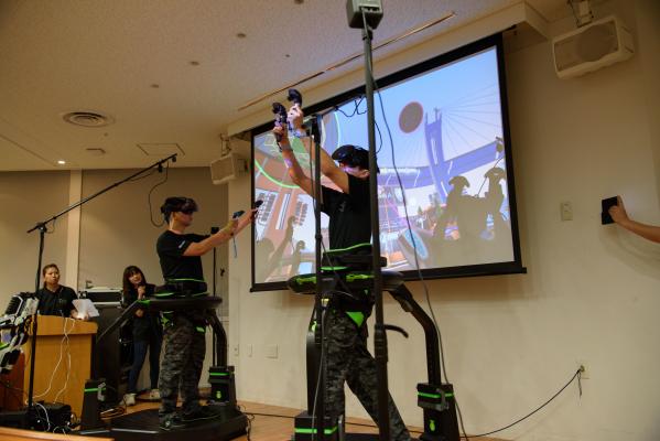デモンストレーションでは実演者がヘッドマウントで見ている画面をスクリーンで見ることができ、動作と画面上の動きにタイムラグがなくリアリティある動きを見ることができた。