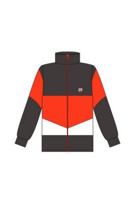 鮮やかなオレンジの校章とファスナーが映える1着です。