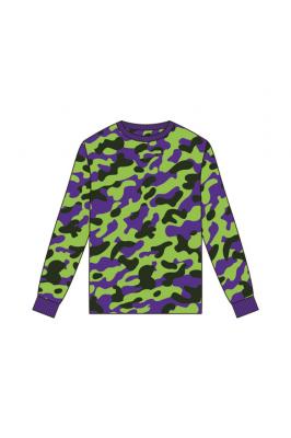 パープル×グリーンのカモフラージュ柄ニット。