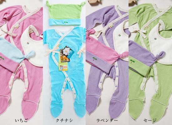 ●選べる4色の天然染め yuga 足つきロンパース+スタイ + 帽子のセット(いちご、クチナシ、ラベンダー、セージ)