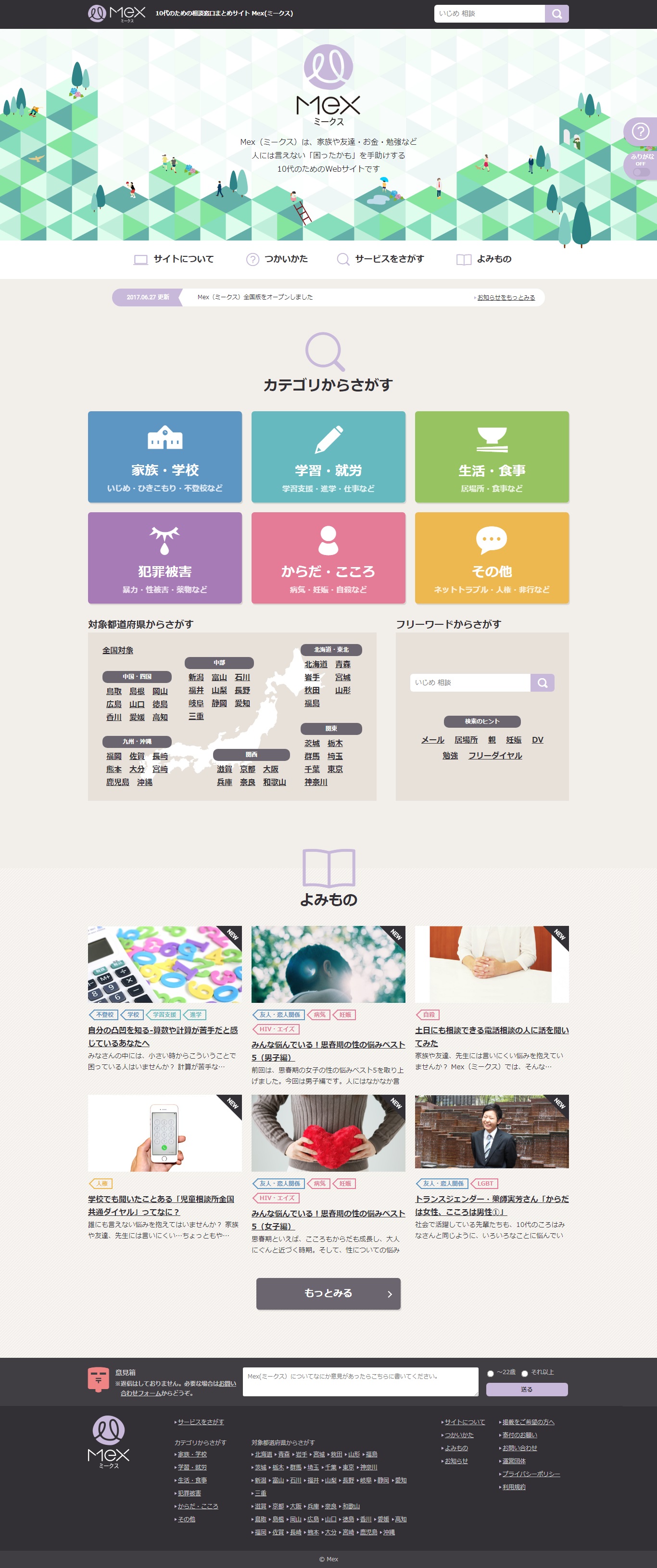 「Mex(ミークス)」は、家族や学校・からだやこころ・お金・勉強など、人には言えない悩みを持っている子どもたちが自分に合った支援サービスを利用できるよう情報をひとつにまとめたサイトで、各サービス情報のページから電話・メールでの相談や予約ができ、インターネットに駆け込んだ子どもたちが安心して相談できる支援団体にいち早くたどりつけることを目指してきました。
