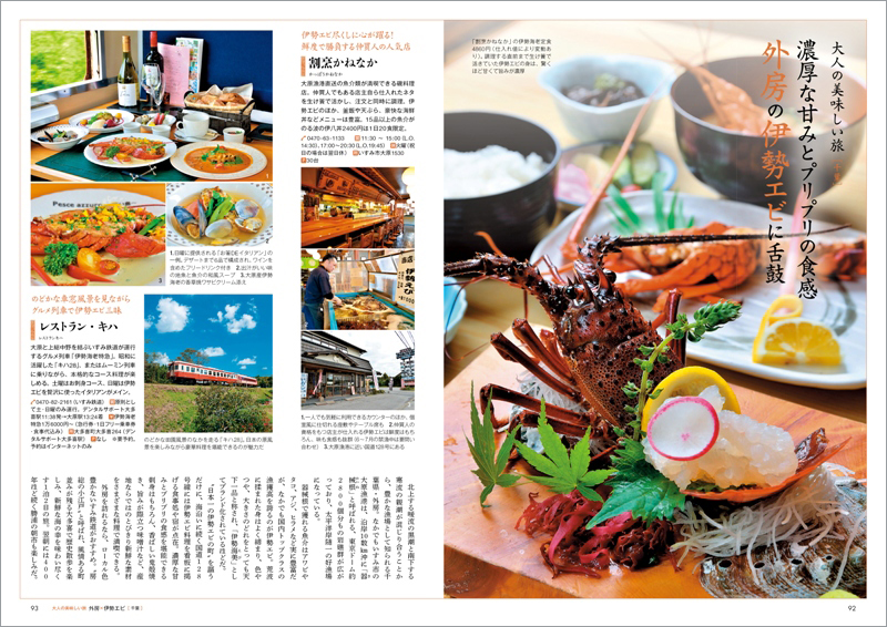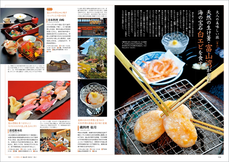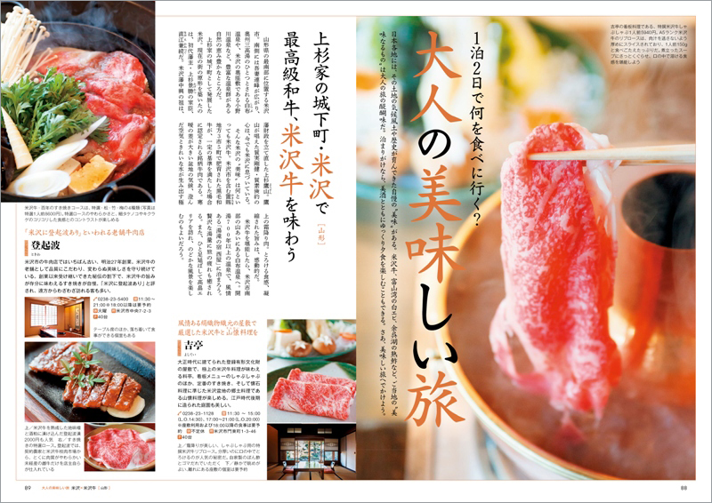 「大人の美味しい旅」では、泊まりがけで食べに行きたいこだわりの名店・グルメスポットをセレクト。米沢×米沢牛、外房×伊勢エビ、笛吹・勝沼×ワイン、下田×地金目、富山湾×白エビ、余呉湖・琵琶湖×熟鮓の6テーマを特集しました。