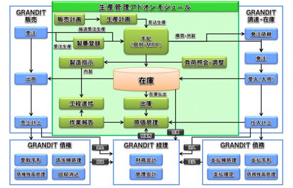 「GRANDIT」は、会計、人事、販売など全10モジュールで構成される統合型基幹業務システム(ERP)であり、「GRANDIT生産ADM」はこれらと密連携した生産管理システムです。顧客の見積、注文から始まり調達、生産、販売および原価、会計までが、全て統合的な取引ステータスで進捗および各種計数の管理を行えます。最新バージョンでは、グループ全体の業務を最適化し、グループ実績を迅速に把握できるグループ経営管理機能を強化しています。