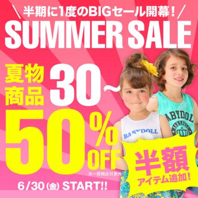 株式会社コージィコーポレーションが運営するベビー・キッズ服ブランドBABYDOLL(ベビードール)がBABYDOLL(ベビードール)・STARVATIONS(スターベイションズ)、通販各店にて、6月30日(金)より『サマーBIG SALE★<30~50%OFF>半額Tシャツ追加!』を開催!