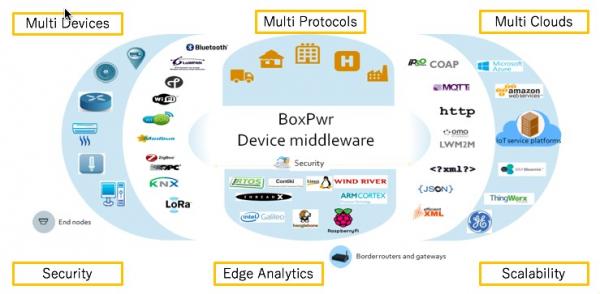 BoxPwrは、さまざまなIoTの用途展開において、デバイスを安全に接続し管理するという課題に取り組むため開発された、ソフトウェアコンポーネントのライセンス可能なフレームワークです。高度に設定変更可能かつ標準規格に基づいたBoxPwrスタックを超低消費電力のエンドノードデバイスからフル機能のゲートウェイに至る様々なハードウェアプラットフォームにあらかじめ搭載することで、フィールドデバイスの様々な要件に応じて容易に拡張することができるようになります。