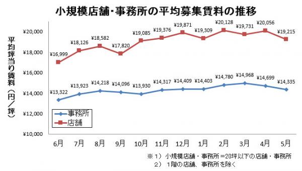 事務所と同様に、5月は賃料低めの物件が募集に多く出た影響で、平均募集賃料が下降した形となっています。