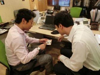 ビンゴゲームは、全社員14名が参加して定期的に開催します。ルールは、タテ・ヨコ5マスずつ、計25個のマス目に、営業8名の名前を3カ所に記入します。それぞれに、「契約1本」「契約金額合計300万」「契約金額合計500万」を用意し、営業が契約した金額に応じて穴を開けます。300万円以下の場合は「契約1本」、次の契約で合計金額が300万円以上ならば「契約金額合計300万」、1回の契約で500万を獲得した場合は、3つの穴が開きます。