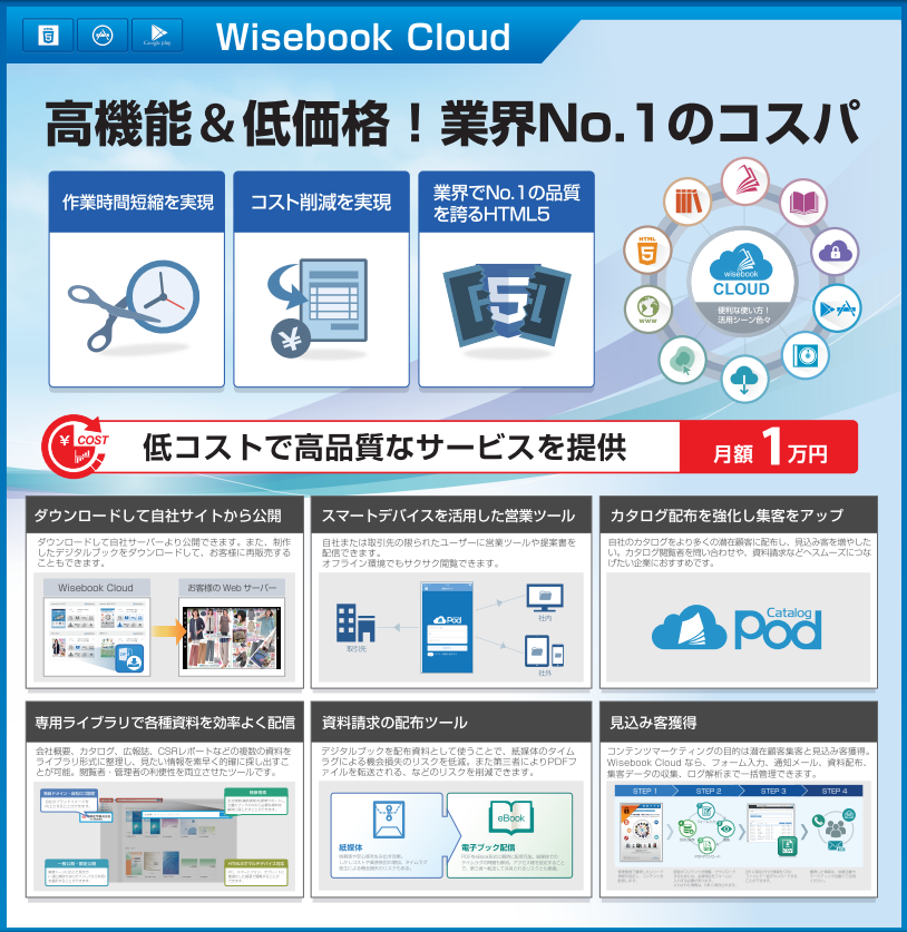 「Wisebook Cloud」は誰でも簡単に高品質のデジタルカタログを作成・配信できるよう設計されたクラウド/ASP型サービスです。