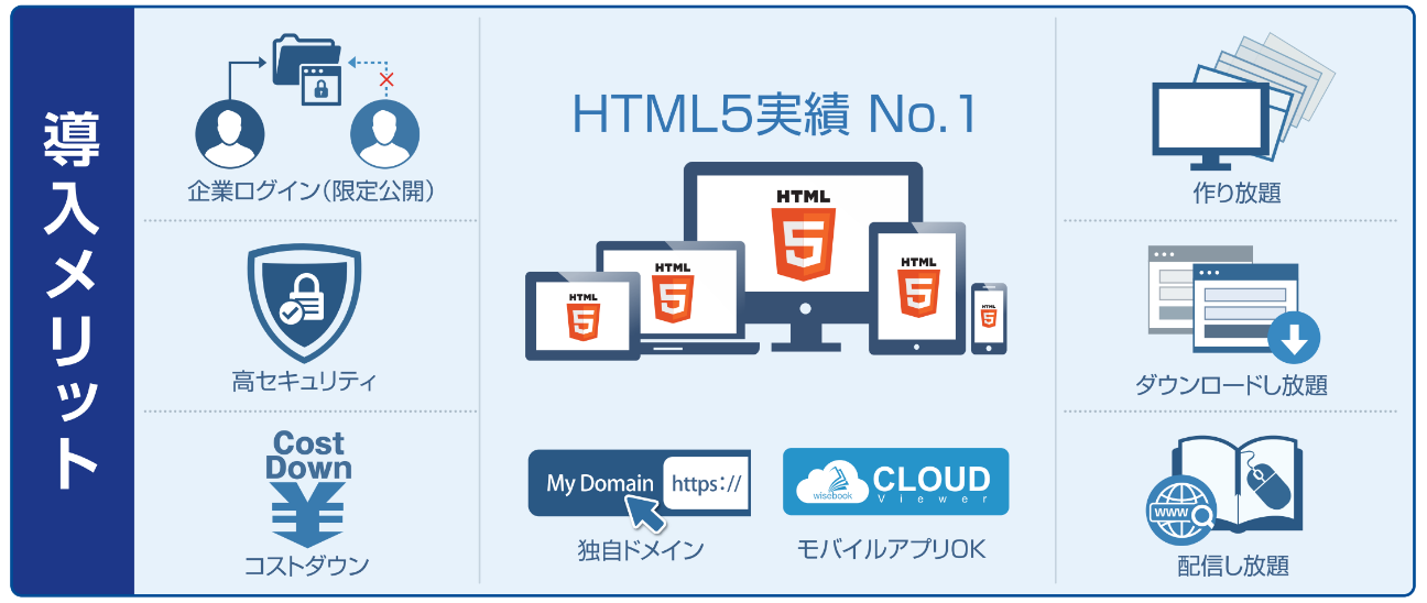 制作から配信・ダウンロードまでの機能、Wisebookの高度なセキュリティ機能を含めた