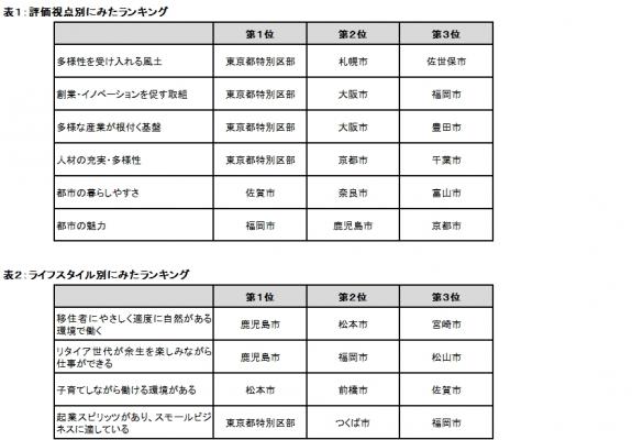 この他、産業創発力を構成する6つの視点別のランキングや、人々が志向する多様なライフスタイル(「移住者にやさしく適度に自然がある環境で働く」「リタイア世代が余生を楽しみながら仕事ができる」「子育てしながら働ける環境がある」「起業スピリッツがあり、スモールビジネスにも適している」)に応じたランキングも作成しています(表1、表2)。いずれかのランキングでトップ10に入る都市は合計40都市ありますが、福岡市は12のランキングの全てで10位以内に入る結果となりました(図3)。