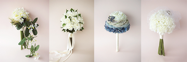 ホワイトコレクションでは、ウエディングの王道カラーであるホワイトの花を使ったデザインを展開しています。色こそオーソドックスですが、それぞれの花の形や特性や、2017年トレンドのファッションからもインスピレーションを得て、ホワイトコレクションでは特にウエディングドレスをイメージさせるチュールやビジューの組み合わせをブーケに取り入れました。その1つの特長に、花嫁をよりいっそう輝かせるスワロフスキー(※2)をすべてのブーケに使用しています。