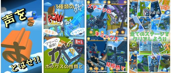 ボックスの性質と、物理シミュレーションに基づいて動くステージギミックを見極め、うまく声をぶつけて、すべてのステージをクリアしましょう!