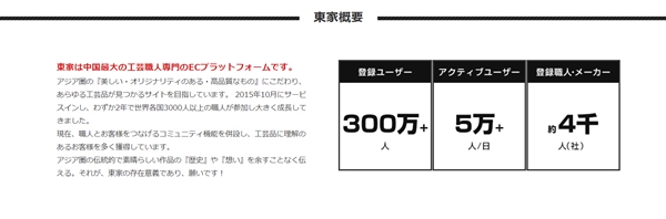 東家は中国最大級の工芸品を専門に取り扱うECサイトです。アジア圏における著名な工芸作家や職人、独自の技術をもつメーカーが出店し自社の作品、製品を販売しています。出店社作品、製品を買う東家ユーザーは多くが伝統工芸品や各国の民芸品に理解のある中国人消費者となります。デイリーアクティブユーザーは5万人を超え、常に良質で独自性の高い工芸品や民芸品、メーカー製品が売買されています。