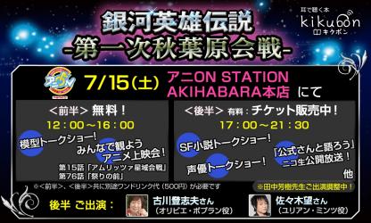 株式会社アールアールジェイ(所在地:東京都新宿区、代表取締役:橋満克文)は、銀河英雄伝説の魅力を様々な切り口でお伝えする為のイベント「銀河英雄伝説 第一次秋葉原会戦」を7月15日12時から、アニON(アニオン) STATION AKIHABARA本店