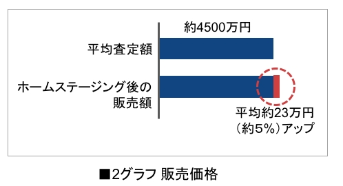 当該物件の当初査定額は平均4500万円で、ホームステージングにより、平均約23万円(約5%)高く売却されています。調査内で最高数値は約9%アップでした。ただし、地域性や物件築年数をはじめとする各種条件により差が出やすいことが判明しており、今後より詳細な条件設定で動向を追跡します。
