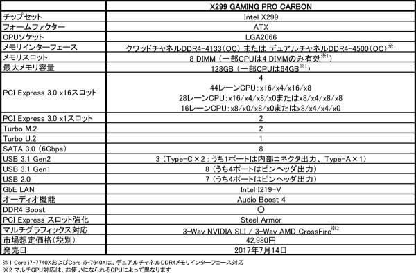 X299 GAMING PRO CARBONの仕様は以下のとおりです。