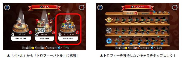 各キャラのトロフィー獲得を目指して、全国のプレイヤーとバトルを行なう「トロフィーバトル」を