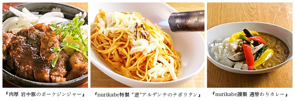 選べるメニューは5種類あり、『白いオムライス』の他は、シェフ自信作のジンジャーソースに岩中豚の旨みが絶品なnurikabe一番人気料理『肉厚 岩中豚のポークジンジャー』※(ランチ限定15食)1,080円やお客様の目の前でチーズを炙るモチモチのパスタ『nurikabe特製 “逆”アルデンテのナポリタン』※880円、7月3日(月)に新たにランチに仲間入りした『nurikabe謹製 週替わりカレー』(ランチ限定)930円、『日替わりランチ』930円を用意しています。