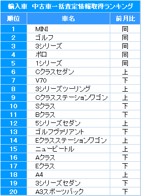 1位MINI・2位ゴルフ・3位BMW3シリーズ・4位ポロ・5位BMW1シリーズとなり6位以下については軽自動車同様乱高下しております。
