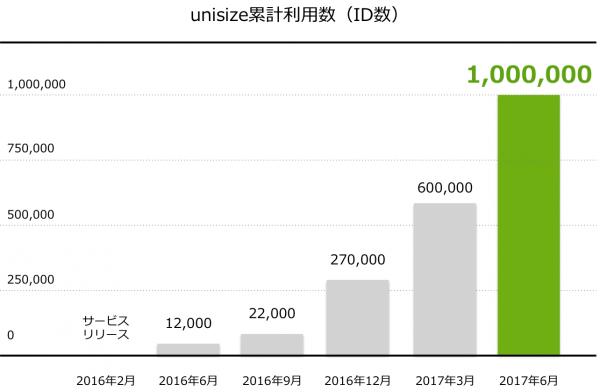 2016年2月8日(月)のサービス開始以降、unisizeはEC利用者の使いやすさを何よりも大切に考え、ECサイトで手間なく身体にあったサイズを確認できるよう、簡単アンケートによる採寸や過去に買った洋服と比較する購入履歴採寸機能などの機能拡充に努めてまいりました。その影響もあり、ご導入いただく企業様が増えるとともに、unisize利用数も急速に伸張し、この度2017年6月末日時点で100万IDを突破するに至りました。