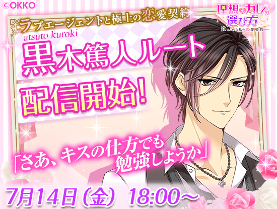 まるで王子様のような気品あふれる雰囲気をもち、女性を華麗に変身させるラブエージェント“黒木 篤人”の本編ルートを7月14日より配信する事が決定いたしました。配信開始後にログインしていただくと、ガチャチケットとシナリオ全回復チケットをもれなくプレゼントいたします。