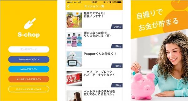 「S(ス)-chop(コップ)」とは、スマートフォンに搭載されているインカメラを使って、商品と一緒に自撮りし投稿することでお金が貯まる日本初のアプリサービスです。