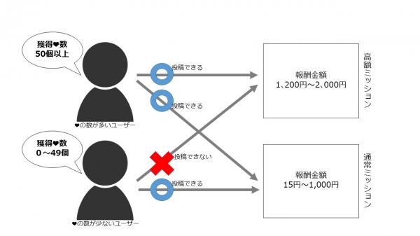 当サービスでは他ユーザーが投稿した自撮り画像に対し、「ハート」を投票することができます。サービスの活性化とユーザーメリットの拡大を目的とし、7月14日から、「ハート」を多く集めているお客様のみが参加できる高額報酬ミッションを導入します。投稿報酬の平均が84円であるのに対し、高額報酬ミッションでは最高2,000円となり、より効率よく報酬を獲得することができます。