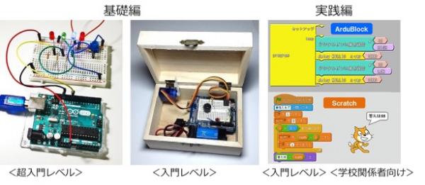 また、入門レベルのArduinoブートキャンプ「光で開くふしぎな小箱をArduinoで作ってみよう!」では、電子工作やプログラミングは初めてという超初心者を対象に、電子工作用の教材を使って、ステップ・バイ・ステップでハードとソフトを追加していきながら学習を進め、最終課題の「ふしぎな小箱」を楽しみながら作り上げるというものです。