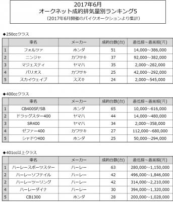 情報流通支援サービスの株式会社オークネット(本社:東京都港区/社長:藤崎清孝)は、2017年6月度のオークネットバイクオークションにおける成約台数を集計し、排気量別ランキングベスト5をまとめました。