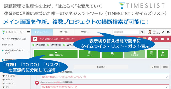 「”はたらく”を変えていく、”できる”が増えていく」環境作りのため、課題管理から始める体系的なマネジメントの考え方・現場と並走する実践の支援・使いやすいツールの3つを組み合わせて提供する株式会社マネジメント(本社:東京都港区、代表:音羽真東)は、 使いながら生産性を確実に上げられる課題管理ツール「TIMESLIST(タイムズリスト)」の、”メイン画面を作新”と"複数プロジェクトの横断検索機能”を2017年7月18日より提供開始しました。