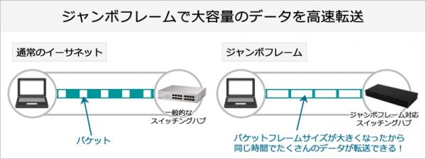 一度に転送するパケットを通常の1,518バイトから最大9,216バイトまで対応する事で、通信効率を高めます。これにより、大容量のデータ転送をスムーズに行なうことが可能です。