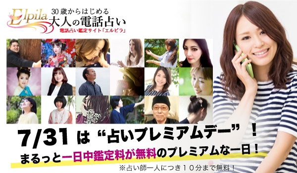 日本初の30歳以上に限定した「大人の恋愛相談専門の電話占い」サービス「Elpila(エルピラ)」(https://otona-denwa-uranai.com)を運営する株式会社フィージア(本社:大阪府西区、代表取締役社長:矢島奈月妃)は、2017年7月31日(月)に、占いが1日中鑑定無料になるイベント「占いプレミアムデー」を開催することをお知らせ致します。