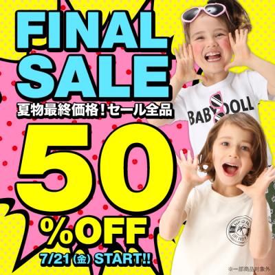 株式会社コージィコーポレーションが運営するベビー・キッズ服ブランドBABYDOLL(ベビードール)がBABYDOLL(ベビードール)・STARVATIONS(スターベイションズ)、通販各店にて、7月21日(金)より『ファイナルSALE★全品50%OFF!在庫限り』を開催します。