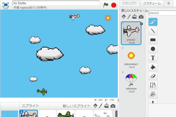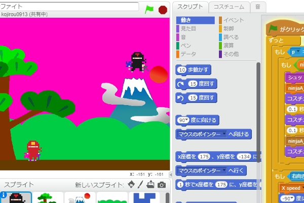 Scratch(スクラッチ)プログラミングの考え方やスクリプトブロックを学びながら、ゲームの基本となる部分を作成します。実際に忍者ゲームまたは飛行機ゲームを作りながら、プログラミングの基本要素である「シーケンス」「ループ」「並列性」「イベント」「条件」「演算子」「変数」を体感します。