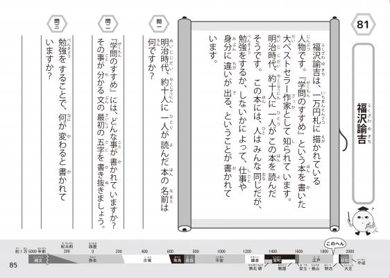 (1)国語の問題を解きながら、歴史の知識も身につけられる、一度に2つの科目を学習できる教材です。