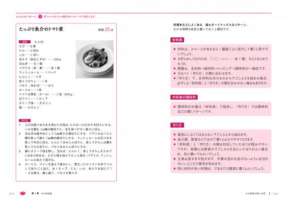 レシピ全体のパターンを決めたら、材料や調理法に応じて、そのつど必要なところを見るだけ。作成する人にも使いやすく、おさえるべきポイント、コツ、基本知識などが簡単にわかります。