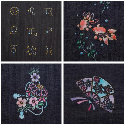 デニムを京友禅で染めた新作の柄約50種類を展示します。オリジナルの和柄を中心に、星座をモチーフした柄や動物の柄など、若い層にも向けた新作柄を取り入れています。京友禅と金彩、金の刺繍を組み合わせた煌びやかな作品も店頭に並びます。